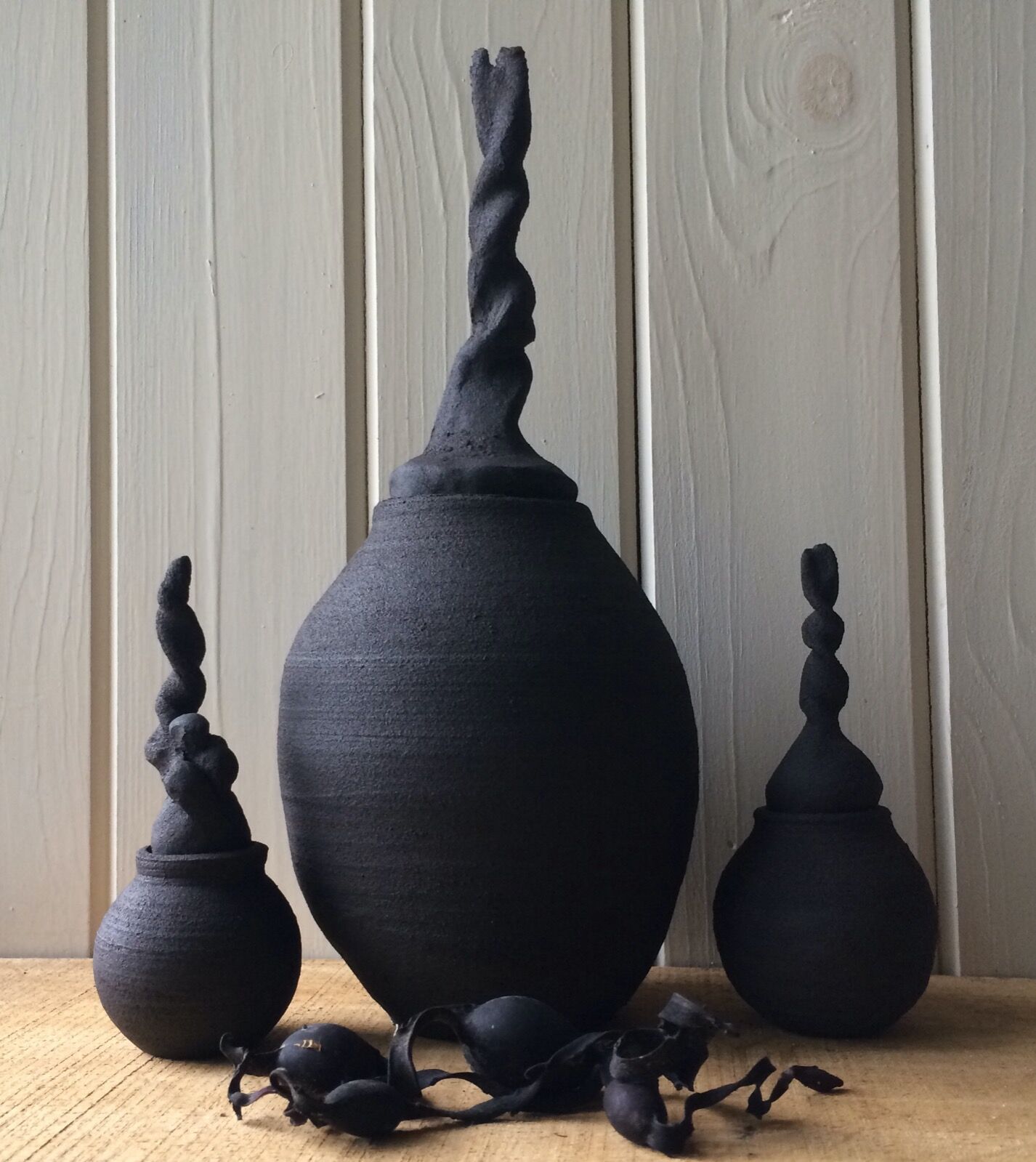 A series of decorative jar forms in black stoneware with twisting spires that echo the habit of Bladderwrack seaweed